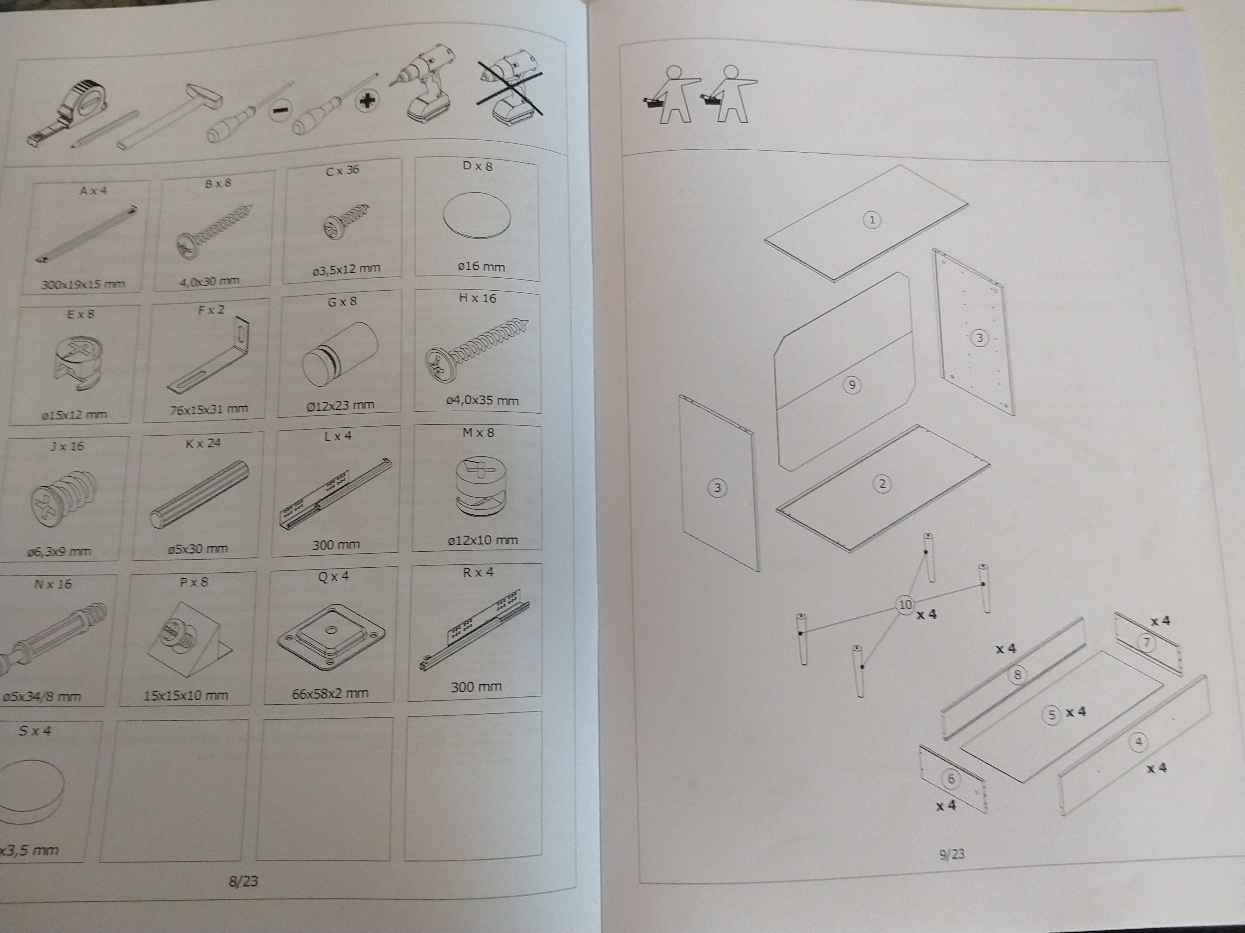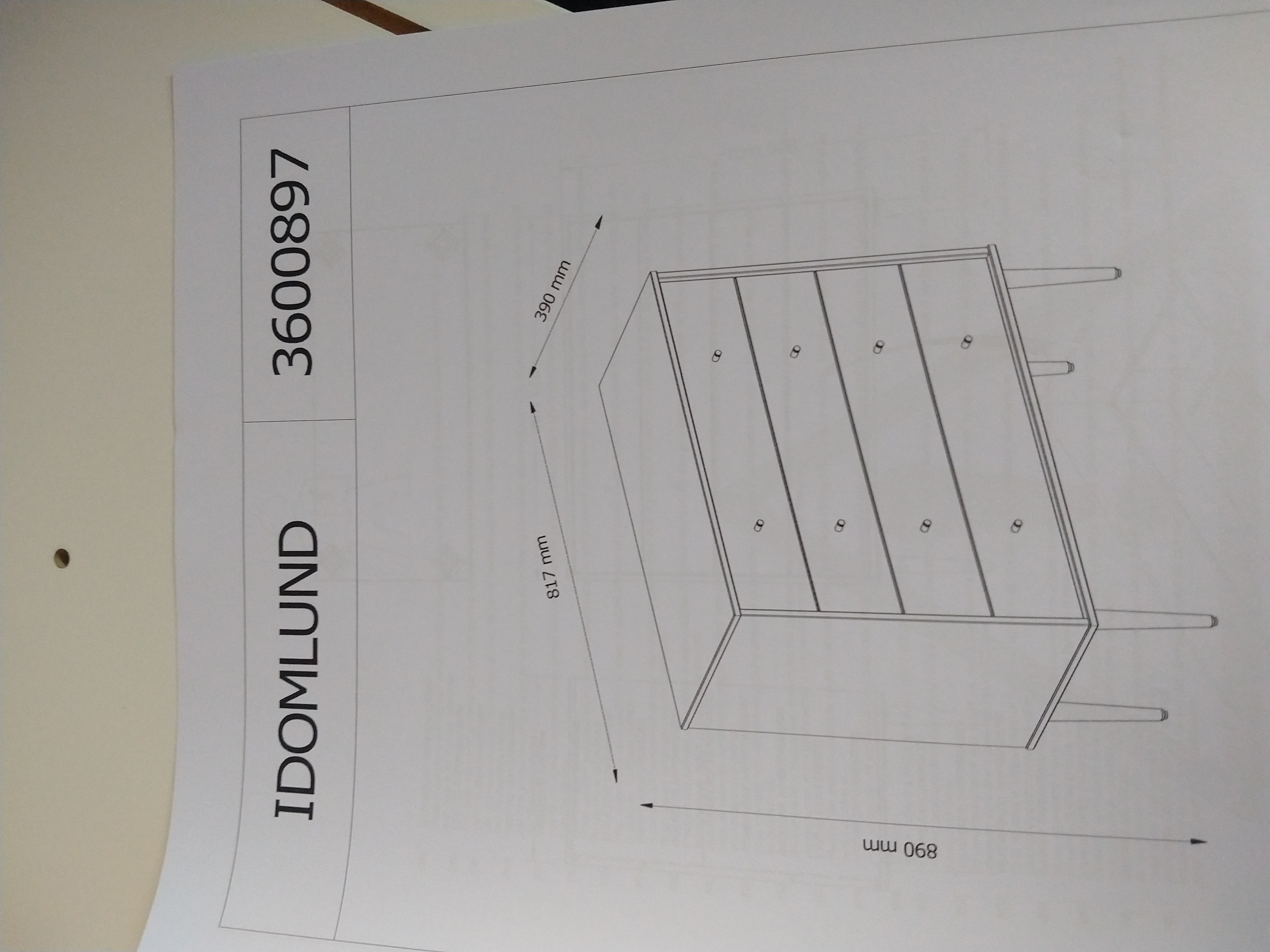 Kommode m.4 skuffer og ben skal samles. Forsatsrude løftes på plads i skinne.