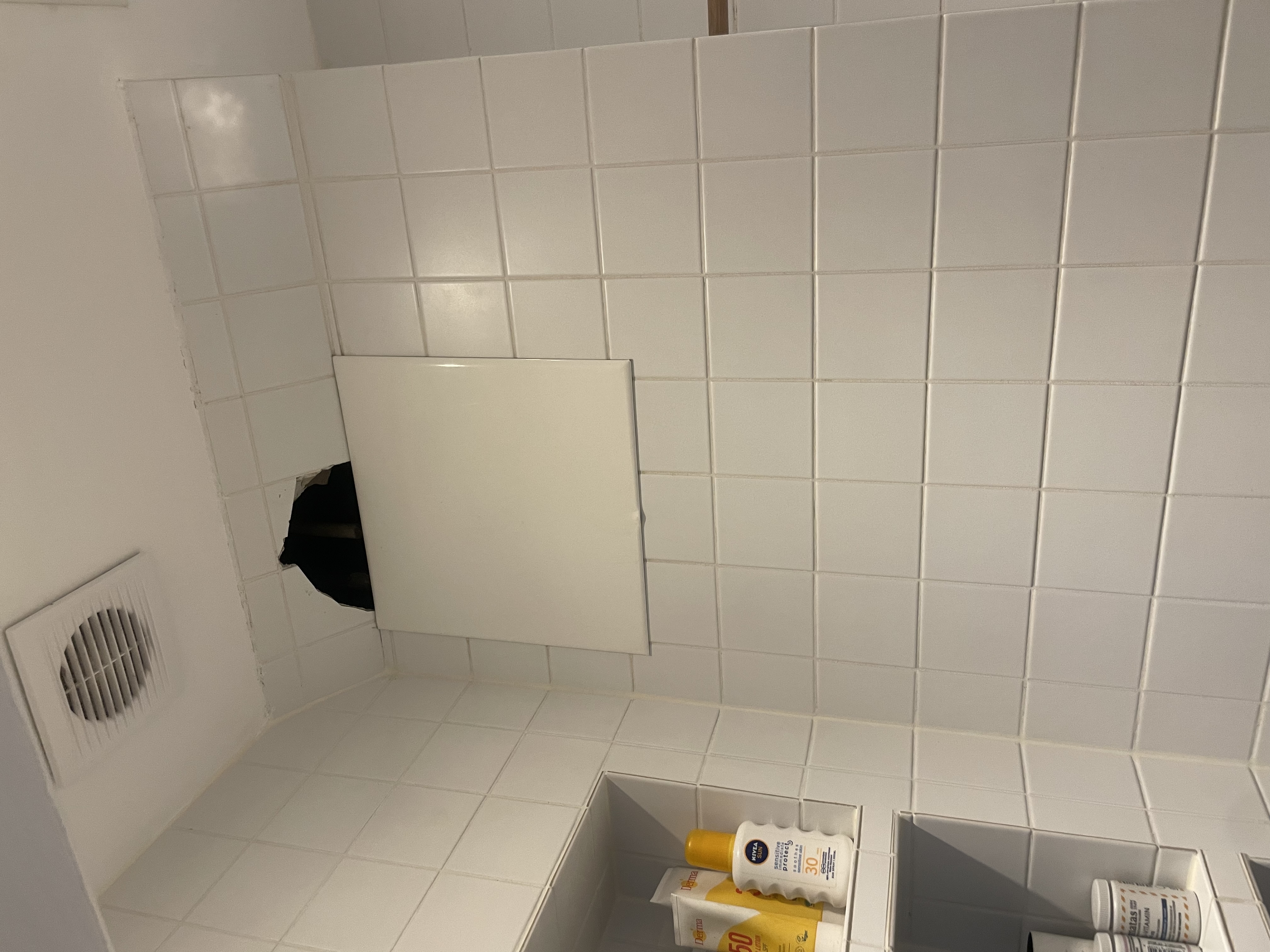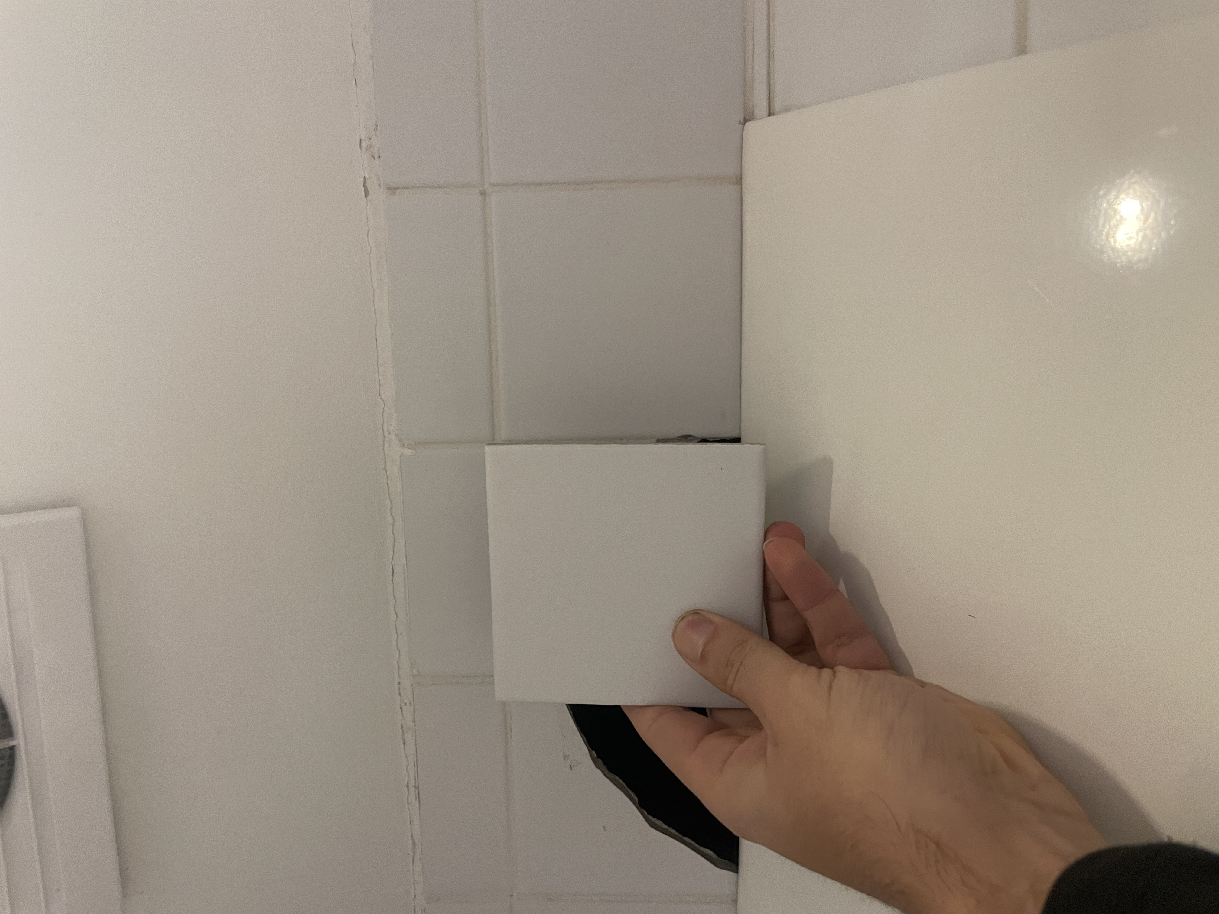 Jeg ønsker tilbud på opsætning af to fliser. De har været banket ned i forbindelse med skift af rør bagved. Der er et “hul” ind, så jeg antager at der skal sættes gips op først? Jeg har selv fliserne.