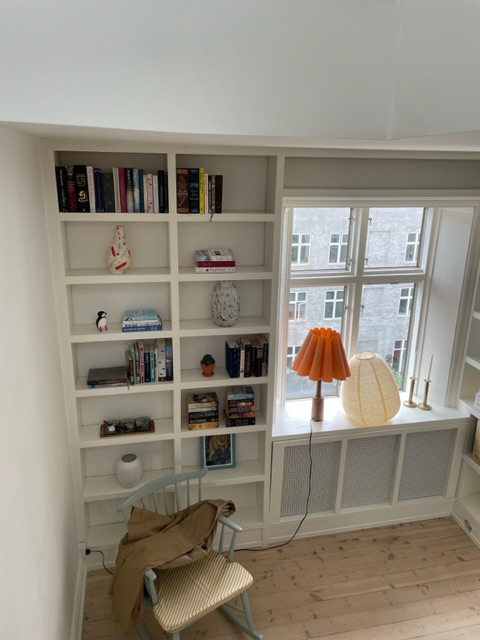 Hejsa! Vi kunne godt tænke os at få lavet skabslåger i de nederste hylder af vores indbyggede reol. Mon du kan hjælpe med det? Samtidig vil vi gerne have repareret et stykke panel (se foto), dvs. der skal sættes er stykke panel ind der, hvor der mangler. Vh Kirsti og Frederik