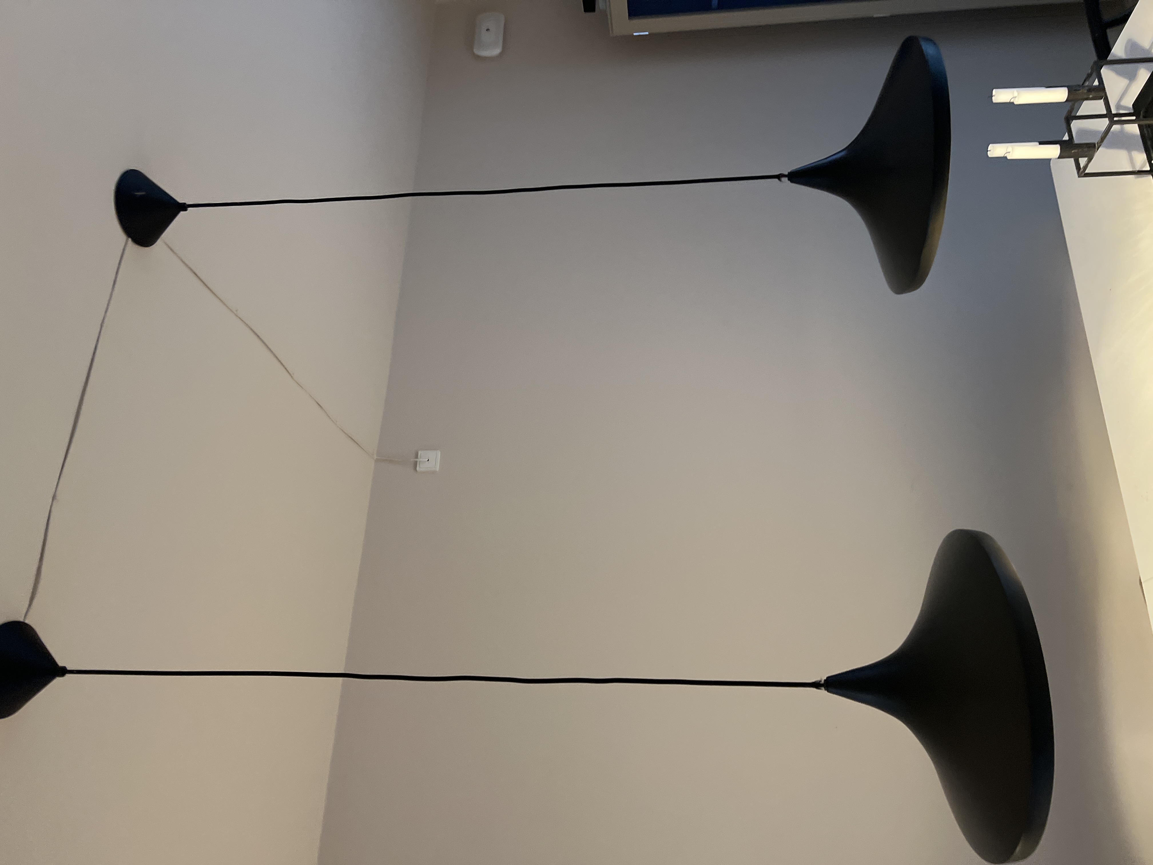 Nedtagning af to gamle lamper og opsætning af to nye. Fra et samlet udtræk. Lamperne er Hay Pao glass pendant. Billedet viser nuværende opsætning.